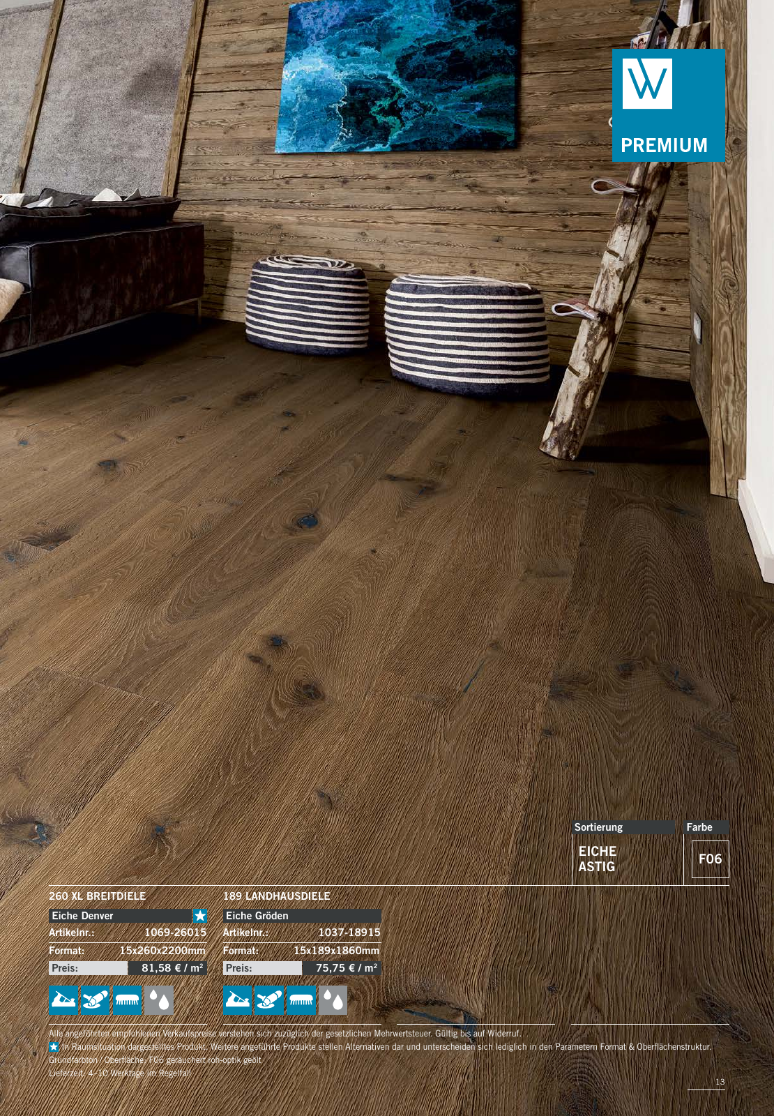 13 Sortierung Farbe Alle angeführten empfohlenen Verkaufspreise verstehen sich zuzüglich der gesetzlichen Mehrwertsteuer Gültig bis auf Widerruf In Raumsituation dargestelltes Produkt Weitere angeführte Produkte stellen Alternativen dar und unterscheiden sich lediglich in den Parametern Format Oberflächenstruktur Grundfarbton Oberfläche F06 geräuchert roh optik geölt Lieferzeit 4 10 Werktage im Regelfall EICHE ASTIG 189 LANDHAUSDIELE Format 15x189x1860mm Artikelnr 1037 18915 Eiche Gröden Preis 75 75 m2 260 XL BREITDIELE Format 15x260x2200mm Artikelnr 1069 26015 Eiche Denver Preis 81 58 m2 F06