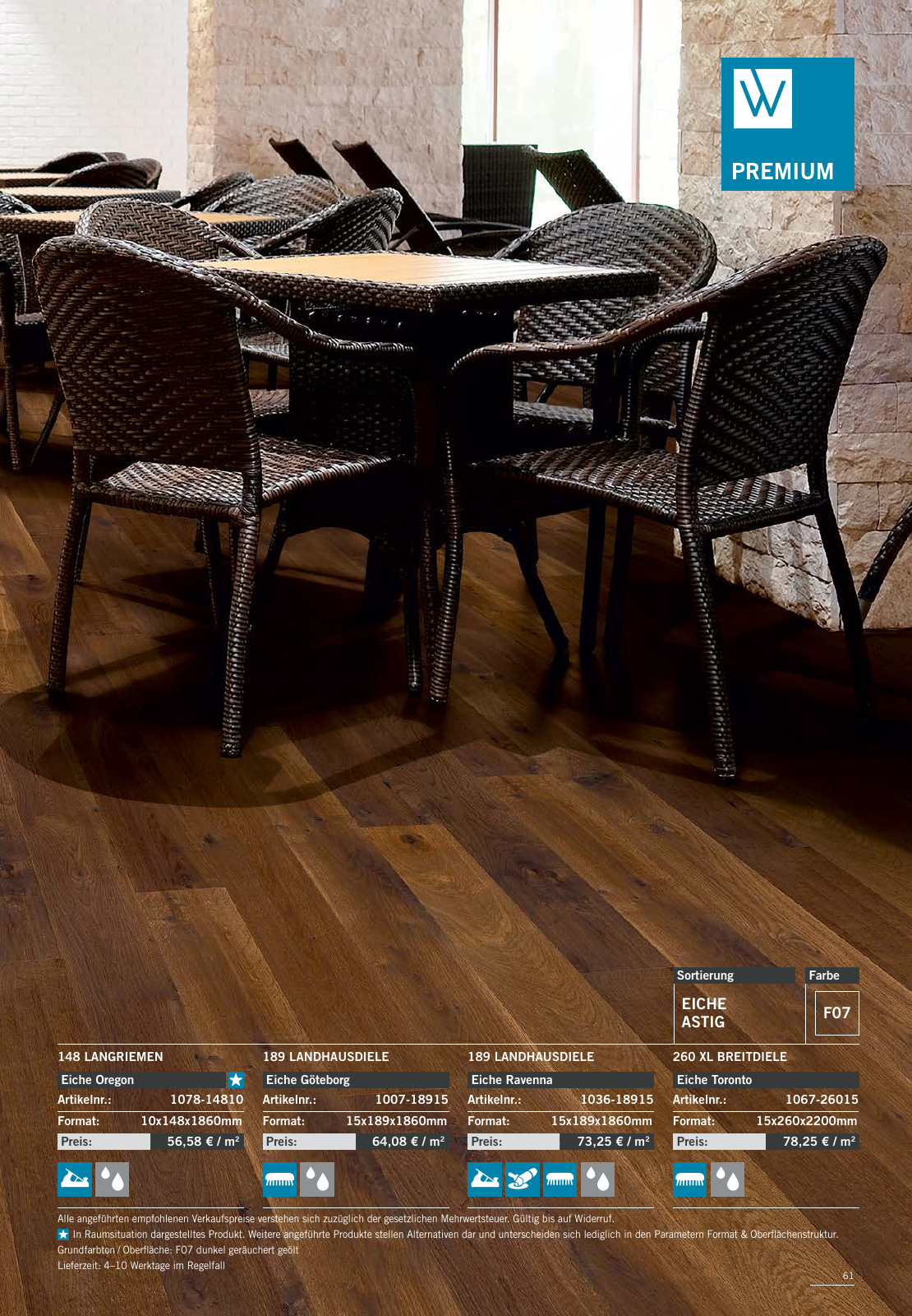 61 Sortierung Farbe Alle angeführten empfohlenen Verkaufspreise verstehen sich zuzüglich der gesetzlichen Mehrwertsteuer Gültig bis auf Widerruf In Raumsituation dargestelltes Produkt Weitere angeführte Produkte stellen Alternativen dar und unterscheiden sich lediglich in den Parametern Format Oberflächenstruktur Grundfarbton Oberfläche F07 dunkel geräuchert geölt Lieferzeit 4 10 Werktage im Regelfall EICHE ASTIG 189 LANDHAUSDIELE Format 15x189x1860mm Artikelnr 1007 18915 Eiche Göteborg Preis 64 08 m2 260 XL BREITDIELE Format 15x260x2200mm Artikelnr 1067 26015 Eiche Toronto Preis 78 25 m2 148 LANGRIEMEN Format 10x148x1860mm Artikelnr 1078 14810 Eiche Oregon Preis 56 58 m2 189 LANDHAUSDIELE Format 15x189x1860mm Artikelnr 1036 18915 Eiche Ravenna Preis 73 25 m2 F07