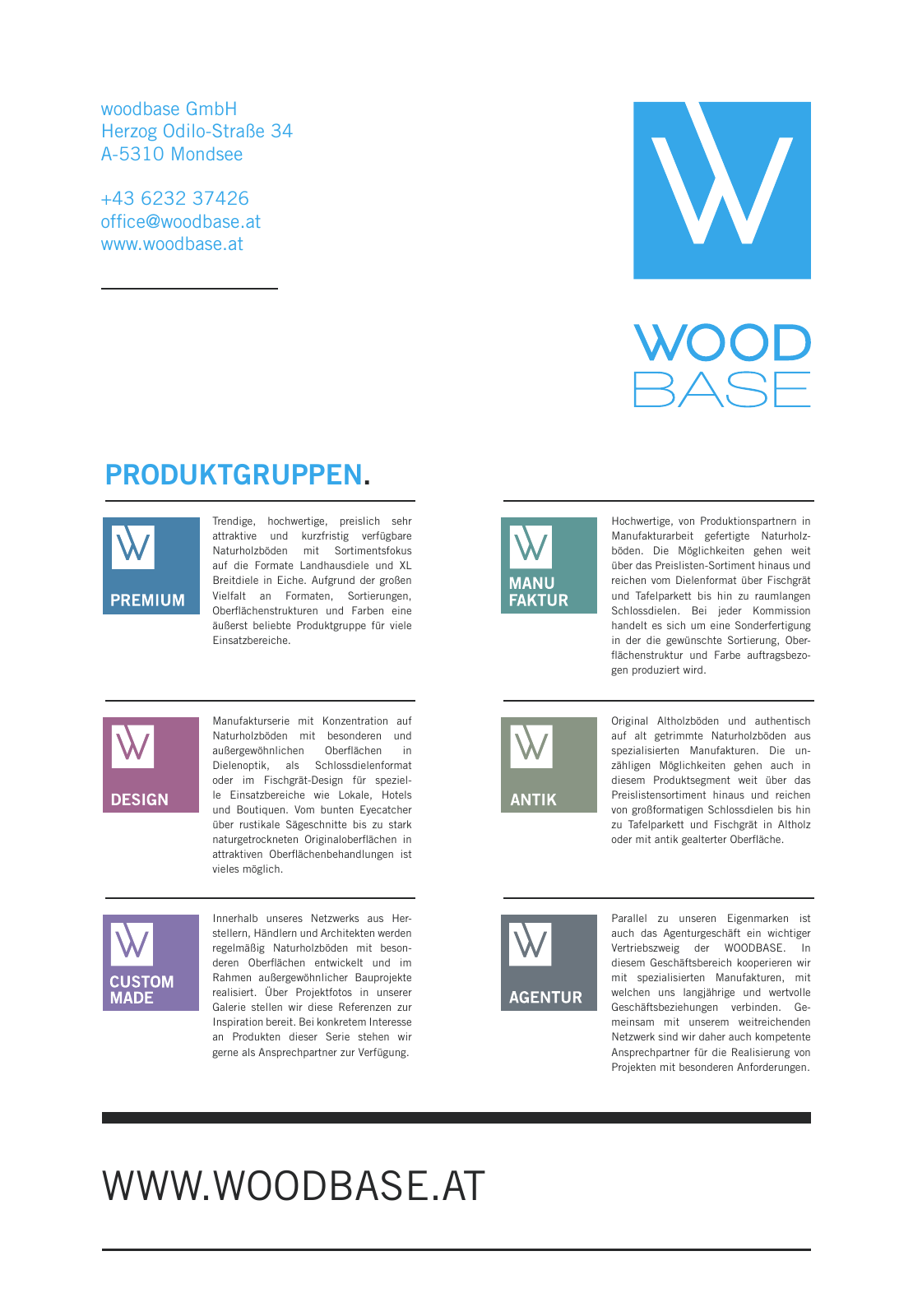woodbase GmbH Herzog Odilo Straße 34 A 5310 Mondsee 43 6232 37426 office woodbase at www woodbase at PRODUKTGRUPPEN WWW WOODBASE AT Trendige hochwertige preislich sehr attraktive und kurzfristig verfügbare Naturholzböden mit Sortimentsfokus auf die Formate Landhausdiele und XL Breitdiele in Eiche Aufgrund der großen Vielfalt an Formaten Sortierungen Oberflächenstrukturen und Farben eine äußerst beliebte Produktgruppe für viele Einsatzbereiche Hochwertige von Produktionspartnern in Manufakturarbeit gefertigte Naturholz böden Die Möglichkeiten gehen weit über das Preislisten Sortiment hinaus und reichen vom Dielenformat über Fischgrät und Tafelparkett bis hin zu raumlangen Schlossdielen Bei jeder Kommission handelt es sich um eine Sonderfertigung in der die gewünschte Sortierung Ober flächenstruktur und Farbe auftragsbezo gen produziert wird Manufakturserie mit Konzentration auf Naturholzböden mit besonderen und außergewöhnlichen Oberflächen in Dielenoptik als Schlossdielenformat oder im Fischgrät Design für speziel le Einsatzbereiche wie Lokale Hotels und Boutiquen Vom bunten Eyecatcher über rustikale Sägeschnitte bis zu stark naturgetrockneten Originaloberflächen in attraktiven Oberflächenbehandlungen ist vieles möglich Original Altholzböden und authentisch auf alt getrimmte Naturholzböden aus spezialisierten Manufakturen Die un zähligen Möglichkeiten gehen auch in diesem Produktsegment weit über das Preislistensortiment hinaus und reichen von großformatigen Schlossdielen bis hin zu Tafelparkett und Fischgrät in Altholz oder mit antik gealterter Oberfläche Innerhalb unseres Netzwerks aus Her stellern Händlern und Architekten werden regelmäßig Naturholzböden mit beson deren Oberflächen entwickelt und im Rahmen außergewöhnlicher Bauprojekte realisiert Über Projektfotos in unserer Galerie stellen wir diese Referenzen zur Inspiration bereit Bei konkretem Interesse an Produkten dieser Serie stehen wir gerne als Ansprechpartner zur Verfügung Parallel zu unseren Eigenmarken ist auch das Agenturgeschäft ein wichtiger Vertriebszweig der WOODBASE In diesem Geschäftsbereich kooperieren wir mit spezialisierten Manufakturen mit welchen uns langjährige und wertvolle Geschäftsbeziehungen verbinden Ge meinsam mit unserem weitreichenden Netzwerk sind wir daher auch kompetente Ansprechpartner für die Realisierung von Projekten mit besonderen Anforderungen