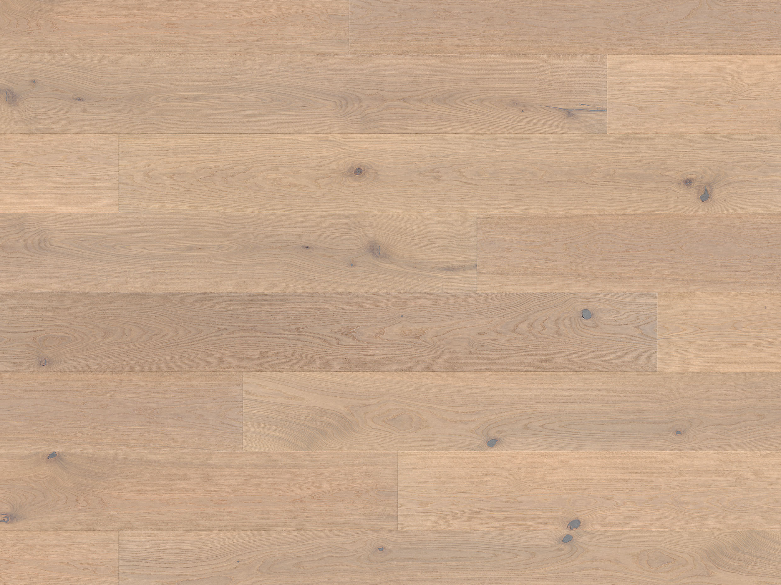 Eiche astig: Lebhafte Holzstruktur, deutliche Farb- & Strukturdifferenzen, dunkelbraun gekittete Äste und vereinzelte kleinere Trocknungsrisse, eiche-typischer Spiegel, geringer Splintanteil.